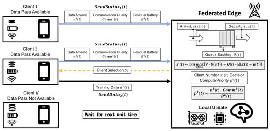 In every unit time, the clients which are available to send datasets notify the federated edge of their quantity of data, communication quality, and residual battery power. The condition of each client is determined internally according to its task priority. Then, the federated edge selects the number of clients to receive the data from, using a Lyapunov control-based time-averaged optimization function.