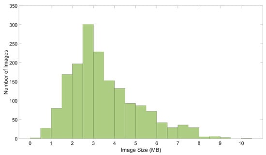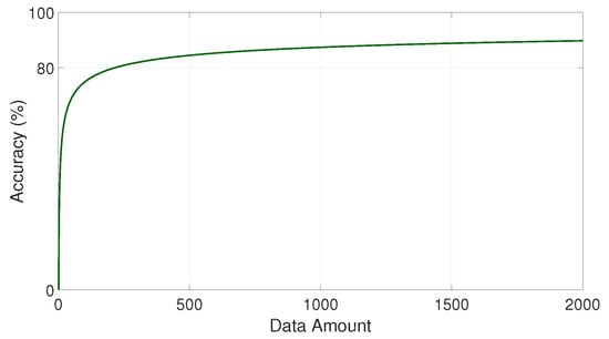We assumed 100,000 training data, which are partitioned between 50 clients, each receiving 2000 data. The selected clients transmit 10 samples to the federated edge per unit time. Each data is an image of 3 MB size. Data size is decided by the image size distribution of the author’s mobile device. The model of the mobile device is Galaxy S8 which equipped 12M pixel camera and 3000 mAh battery. Figure 7 shows the image size distribution of 1700 data. The average size of data is 3 MB and decided as the data size for the simulation. The initial values of V and are and . In practice, can be determined depending on the system, then V can be properly selected. The utilization function is assumed as the anticipated accuracy when the number of clients is decided as . This expected accuracy is modeled by the learning curve [], as shown in Figure 8.