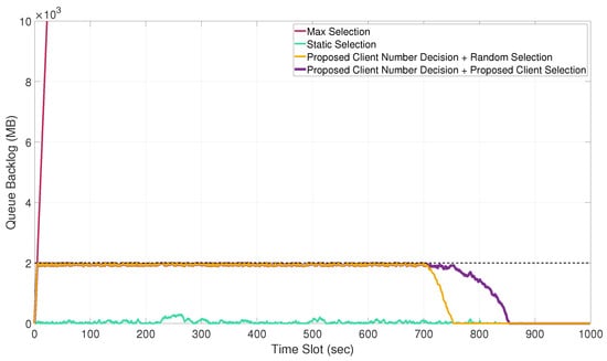 As a benchmark scheme to compare against our algorithm, we consider a FL procedure that selects random clients from a static number of clients, where the client fraction []. The number of clients for each unit time of the first two methods are constant, thus we can compare the queue stability and achieve a long queue backlog, which is related to the utility function under our proposed algorithm. In addition, the last case is considered to evaluate the resource-aware client selection of our proposed algorithm. It decides the number of clients in a similar way to our proposed algorithm, but selects random clients without considering their available resources. Every method selects the client randomly after deciding upon the number of clients to receive the data from; however, the last one decides the number of clients in a manner identical to that of our proposed algorithm. Our proposed algorithm decides the number of selected clients for each unit time according to the queue status, and selects the clients according to their resource statuses.