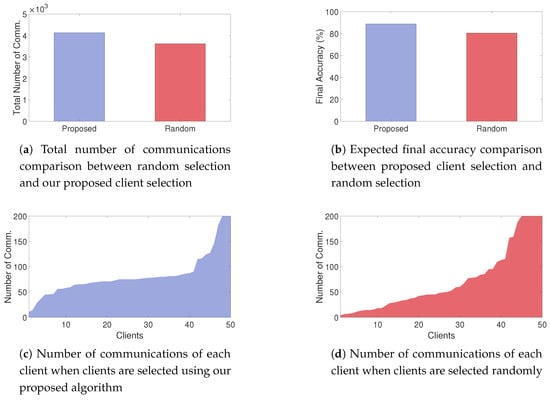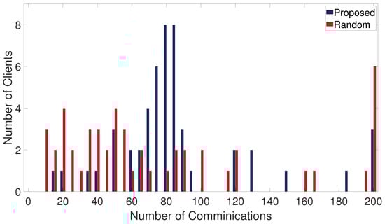 Our proposed algorithm could also improve the fairness of client selection. Improved fairness can decrease the likelihood of overfitting, which can arise from unbalanced training data exchange between clients. Figure 10c,d show the number of communications of each client when the clients are selected using our proposed algorithm and at random, respectively. Although random selection shows large differences in the number of communications between clients, our proposed client selection shows relatively fair communication numbers between clients. Comparing the two client-selection algorithms, we see that the variance value of the proposed algorithm is 41.76, this is reduced from the variance under random selection, which is 62.7. Figure 11 shows the histogram of the number of clients for each number of communications. The communication counts for each client of random selection are unbalanced. Because the communication counts differ widely between clients, some of the clients send large amounts of data and others send less. The top 10 clients of random selection, which comprise 20% of the total set of clients, communication 47% of the total communications. These clients are the clients which have more battery and more data but didn’t selected at the early time slots and selected frequently at the late time slots.