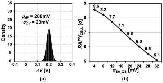 The recently proposed offset-canceling dual-stage SC (OCDS-SC) has improved RAPYCELL by reducing σ∆V due to the offset voltage cancellation in the SC and by increasing μ∆V due to the double-sensing-margin structure [6]. Figure 1a shows an example of the ΔV distribution of the OCDS-SC with μ∆V = 200 mV and σ∆V = 23 mV. Figure 1b shows that RAPYCELL can be significantly improved by developing a novel SA with much smaller σSA_OS than the typical σSA_OS value of 20 mV [7]. If the improved RAPYCELL value is greater than a target RAPYCELL value, the read energy can be significantly saved by trading-off the improvement in RAPYCELL [9,10].