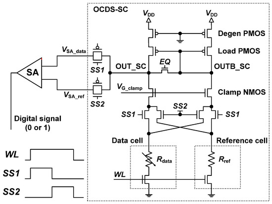In the OCDS-SC, two SA input voltages, VSA_data and VSA_ref, are generated with a time difference due to the dual-stage sensing operation, as shown in Figure 2. In the first stage, SS1 is activated, and VSA_data generated in the OCDS-SC is introduced into the SA. In the second stage, SS2 is activated, and VSA_ref generated in the OCDS-SC is introduced into the SA. However, because of the time-difference input, a capacitive-coupling problem occurs when a conventional voltage-latched SA (VLSA) is used. Figure 3 shows the capacitive-coupling problem in the VLSA in which VSA_ref changes VSA_data to some extent (Δ) through parasitic capacitors. This problem increases σSA_OS from 20 mV to 30–50 mV, depending on the ratio of the output loading capacitance to the parasitic capacitance. Thus, the SA for the OCDS-SC should not be a VLSA type to avoid the capacitive-coupling problem.