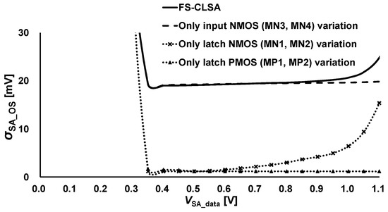 In addition, in the FS-CLSA (Figure 4a), because σSA_OS is dominantly determined by the input NMOSs, σSA_OS can be effectively reduced by canceling only the offset in the input NMOSs. Figure 7 shows σSA_OS of the FS-CLSA according to the SA input voltage (VSA_data) when process variation is applied only to the input NMOSs (MN3 and MN4), only to the latch NMOSs (MN1 and MN2), only to the latch PMOSs (MP1 and MP2), and to all the transistors. Figure 7 clearly shows that σSA_OS is more sensitive to the input NMOSs than to the transistors because the input NMOSs operate in the saturation region, whereas the latch NMOSs operate in the linear region. Thus, the VTH mismatch between MN1 and MN2 becomes less sensitive. Meanwhile, the latch PMOSs do not operate at the initial sensing period. Thus, the VTH mismatch between MP1 and MP2 becomes negligible. The variation in the latch NMOSs of the FS-CLSA has more effect on the σSA_OS as VSA_data increases because the initial voltage in the small parasitic capacitance between MN1 (MN2) and MN3 (MN4) is discharged much faster with increasing VSA_data, resulting in the latch NMOSs operating in the saturation region.