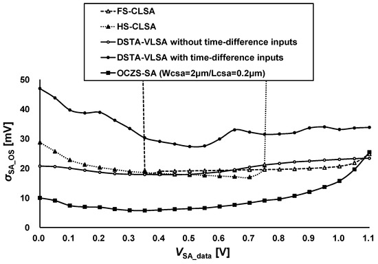 Figure 8 shows σSA_OS according to the SA input voltage (VSA_data) of the FS-CLSA, HS-CLSA, VLSA with double switches and transmission gate access transistors (DSTA-VLSA) without time-difference inputs, DSTA-VLSA with time-difference inputs, and OCZS-SA. Among the various VLSAs such as the VLSA with an NMOS footswitch and PMOS access transistors, VLSA with a PMOS headswitch and NMOS access transistors, and DSTA-VLSA, only the latter is compared in this paper because only the DSTA-VLSA can achieve a zero sensing dead zone [7]. As mentioned in Section 2, the capacitive-coupling problem increases σSA_OS of the DSTA-VLSA when time-difference inputs are applied to the DSTA-VLSA. The FS-CLSA and HS-CLSA suffer from the sensing-dead-zone problem. On the other hand, Figure 8 clearly shows that the OCZS-SA achieved 2.1 times smaller σSA_OS of 9.62 mV on average (minimum σSA_OS = 5.07 mV at VSA_data = 0.3 V; maximum σSA_OS = 25.41 mV at VSA_data = 1.1 V) with a zero sensing dead zone. In the same manner as that of the FS-CLSA, the variation in the latch NMOSs of the OCZS-SA significantly affected σSA_OS as VSA_data increased. Thus, σSA_OS tended to increase with VSA_data.