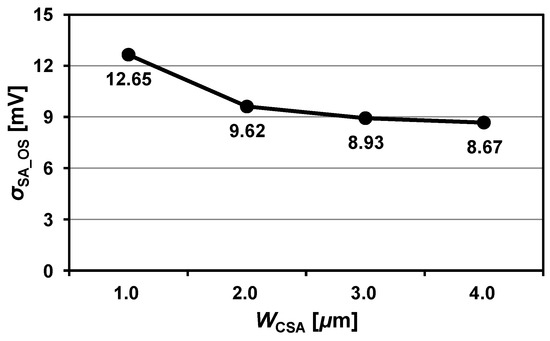 Figure 9 shows the average σSA_OS of the OCZS-SA according to the width of the PMOSCAP for CSA (WCSA) when the PMOSCAP length (LCSA) was 0.2 μm. By considering the area overhead, a WCSA value of 2.0 μm was selected. We note that the effect of the CSA size on the loading of the OCDS-SC is negligible because CSA was serially coupled to the input capacitance (CIN) at nodes IN and INB (total loading capacitance = CSA//CIN ≈ CIN).
