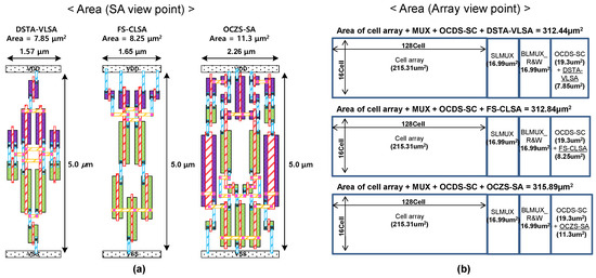(a) Simplified layouts of DSTA-VLSA, FS-CLSA, and OCZS-SA. (b) Estimated array architecture areas when DSTA-VLSA, FS-CLSA, and OCZS-SA are employed.
