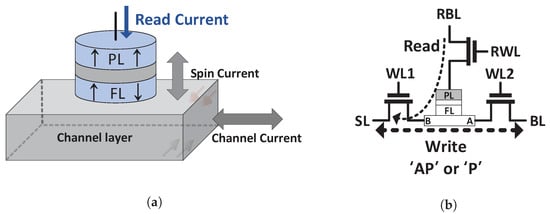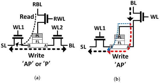 STT-MTJ has two terminals, and the write/read current is directly passed through the MTJ device. In contrast, SOT-MTJ has three-terminals, and the write current path is isolated from the read current path. This is achieved by adding one channel layer under the free layer. The charge current flows through the channel layer that induces a spin current on the FL as illustrated in Figure 1a. As the charge current is divided by the spin state (up or down) of the electron, a spin current perpendicular to the charge current is generated. The spin current exerts a damping-like-torque on the magnetization of the free layer. Because the Rashba–Edelstine effect by the interface, a magnetization switching occurs [,]. Once the access transistors are turned on by wordlines (WL1 and WL2), a current flows through the access transistors and the channel layer. If the current supplied by the access transistors is sufficiently large, the MTJ undergoes a state change to the AP or the P by the voltage on BL and SL. To read the MTJ’s data, a relatively low current is passed through the top terminal by raising a read bitline (RBL) and a read wordline (RWL) with low SL as shown in Figure 1b. Because the current path for the read operation is isolated from the write current path, high endurance and less read-disturbance are achieved. However, compared to the STT-MTJ, one more terminal is required for the channel layer which contributes to the total area increase.