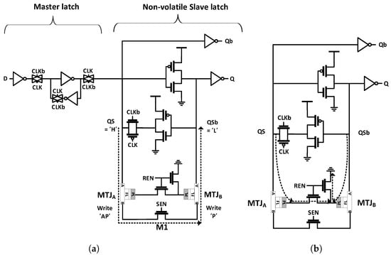 Schematic of the proposed SLS NVFF: (a) Storing operation (Q = 0), (b) Restoring operation (slave latch only).