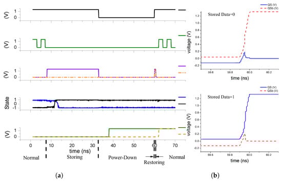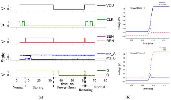 Figure 3 shows the waveforms at each node of the proposed circuit where D is changed from one to 0. The waveforms show the change of the node voltage on VDD, CLK, SEN, REN, D, and Q. mz_A and mz_B are spin directions of MTJs on Z axis. 1 and −1 denote anti-parallel and parallel states, respectively. In power-down mode, Q drops low, but Q is restored at 62 ns when power is back. Once the REN becomes high, a regenerative feedback of an inverter pair begins and the values of MTJs are restored. The leakage current goes to MTJA and MTJB and different voltages are developed on QS and QSb as shown in Figure 3b. If the resistance of one MTJ is greater than that of the other MTJ, the regenerative feedback ultimately generates Vdd or 0. On the top figure in Figure 3b, QS goes to Vdd because RMTJA is greater than RMTJB which means the stored data is ‘1’. If the stored value is ‘0’, QS would become 0 as the bottom figure in Figure 3b.