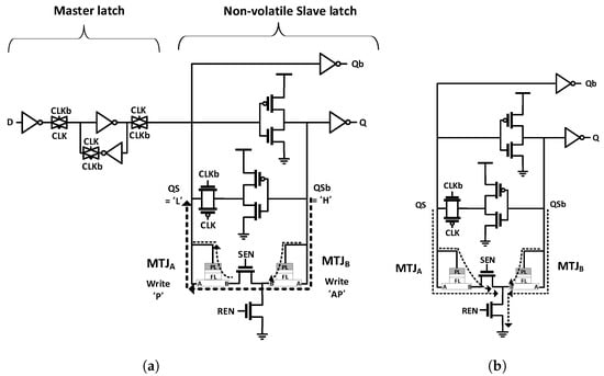 - Park, J. Area-efficient STT/CMOS non-volatile flip-flop. In Proceedings of the 2017 IEEE International Symposium on Circuits and Systems (ISCAS), Baltimore, MD, USA, 28–31 May 2017. [Google Scholar] [CrossRef]