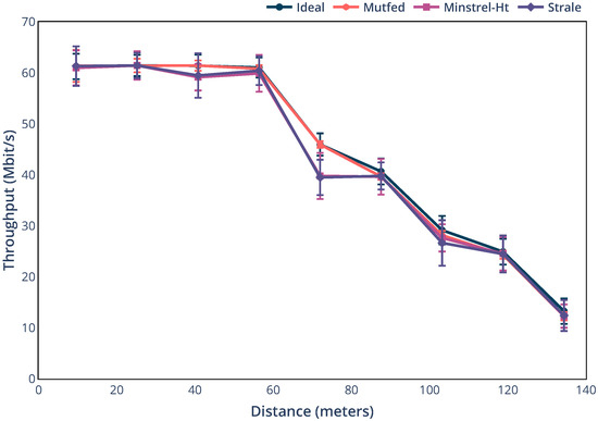 We measured the throughput of the four algorithms with the station moving away progressively from the AP. As seen in Figure 1, although the results of all tested algorithms are similar, Ideal and Mutfed RAA performed slightly better than MinstrelHT and Strale. Thanks to its fast feedback and decision making, Ideal algorithm can detect channel changes faster than other algorithms and adapts the rate accordingly. It is noticeable that MutFed has a slightly lower throughput than Ideal due to the fact that MutFed takes the decision every 10 frames. Thus, when the channel conditions deteriorate, the decision is not directly made, causing frame losses. MinstrelHT and Strale have a lower achieved throughput. These two algorithms take some time to lower the rate when needed, because the decision is made based on random probing and FLR in the case of MinstrelHT and on A-MPDU size adaptation in the case of Strale.