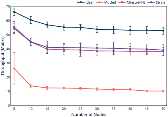 Figure 2 shows the overall physical throughput received at the access point. Ideal RAA performed better than the other algorithms due to its fast reaction to channel changes, while the two implicit feedback algorithms (Strale and Minstrel-HT) take more time to recover after the channel conditions change. On the other hand, the Strale algorithm performed slightly better than Minstrel-HT, because, instead of decreasing the rate, it tries to find an optimal size of the A-MPDU in which it provides a better throughput at the current rate when compared to stepping to a lower rate.