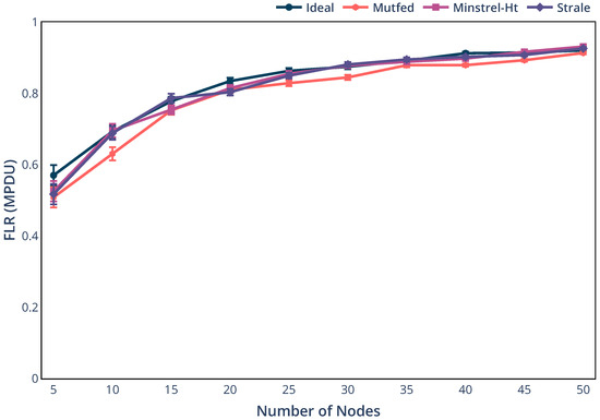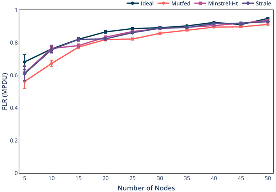 We noticed from Figure 4 that, when the node density increases (>20 for example) causing the interference level to increase, the gap of the A-MPDU FLR between RAAs relying on SINR and other RAAs is increased. This is due to the fact that the SINR values better reflect the channel condition.