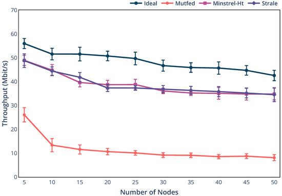 In this scenario, we consider an Ad hoc network scenario. All of the nodes are placed randomly in a square field. They move at a speed of 6 m/s and change their direction randomly every 3 s. They send a constant UDP traffic rate of 60 Mb/s to a sink node. Half of the nodes are traffic generators and the other half are sink nodes. The number of nodes is gradually increased from five to 50 nodes.
