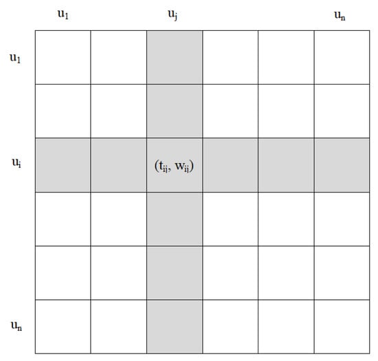 In computer science, there are typically two methods to build the data structure of a graph: adjacency-matrix and adjacency-list. In this study, we select the adjacency-matrix method to generate the directed graph we desire. Each element in the adjacency-matrix consists of two values, which respectively represent the trust relationship and the trust weight from a trustor named to a trustee named , as shown in Figure 2. The constructing process of the directed graph G representing the users’ social trust network can be described as Algorithm 1. The construction of the users’ social trust network first incorporates all of the pairs of direct trust relationships between users to acquire the user set U and the trust matrix T, then calculate LSI factors to form the weight matrix W based on the existing trust relationships.