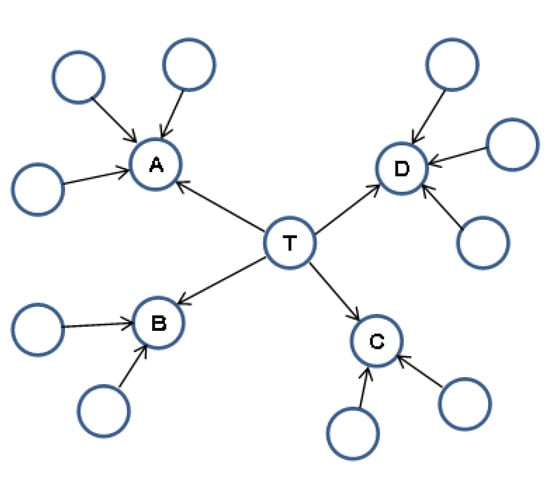 Let’s take an example. As shown in Figure 3, the arrow represents the trust direction. Suppose the target user is T, who has four reference users i.e., trustees including in their social trust network. Now let’s calculate the respective LSI of to T. For user A, from the Figure 3, we can see that A has four trustors in total. Similarly, users , respectively, have trustors. The total number of trustors of all reference users is . According to the definition of LSI, their respective LSI value is . Note that these LSI values are calculated for the target user T. In this sense, we consider the trust weight for target user T to is respectively . Apparently, LSI is a variable value to different target users even for the same reference user.