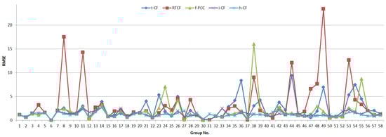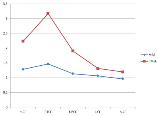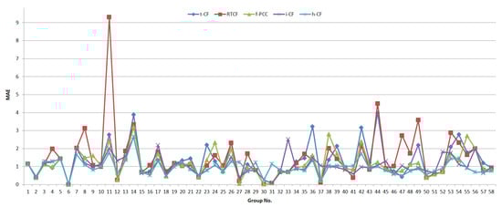 In this section, we aim to make comparisons among five different methods based on PCC: the traditional CF method (t-CF), RTCF, f-PCC, the improved CF method (i-CF) and the hybrid recommendation method (h-CF), wherein the RTCF method is proposed by Parham Moradi et al. in Ref. [] and f-PCC by Shuai Ding et al. in Ref. []. To achieve this goal, we attempt to conduct five sets of experiments based on the obtained 71 files in the previous section, separately employing five methods based on PCC, i.e., Equation (3), Equation (9), Equation (10), Equation (4), and Equation (6). According to the descriptions in Section 5.4, obviously, we do not set the PCC similarity threshold for reference users in any group. This means that the values of PCC similarities vary in range [−1, 1] in this section.