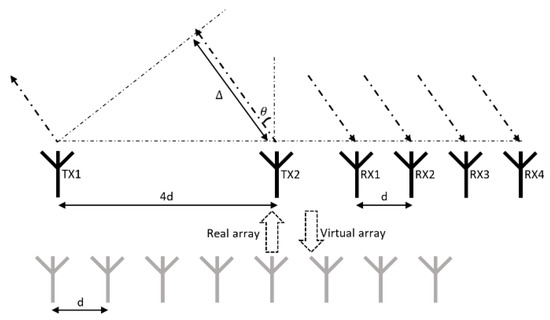 The signal emitted by the two transmitting antennas will result in a steering vector equal to , synthesizing a virtual array of eight elements. Two popular approaches employed for separating the signals coming from the two different transmitters involve the orthogonality between the transmitting channels and they exploit time division multiplexing (TDM) or binary phase modulation (BPM) [25]. In the former, the transmission is divided in time slots attributed to each different transmitting antenna, whereas in the latter the transmission between the two channels is simultaneous while the phases are 0 or π.