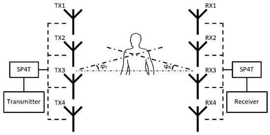 In [40,41,42] some examples where a MIMO radar is exploited for the human detection in cluttered environments are shown. In detail, in [42] a bistatic MIMO radar has been employed for estimating the target location. The conceptual scheme of the system presented in this work is shown in Figure 6.