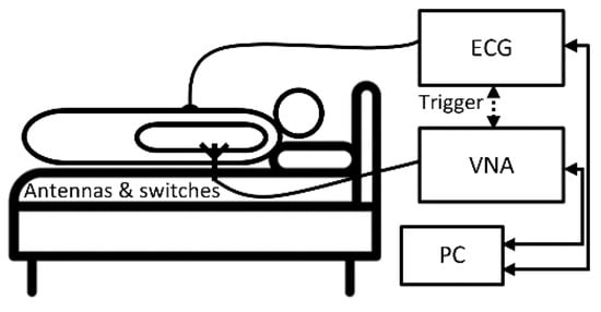 In [44], a feasibility study concerning the extraction of the radar image of the human heart by using an UWB radar has been proposed. The UWB radar is composed by a vector network analyzer (VNA), a switching system, a beamformer and the antennas. In detail, a 56-elements non-uniform antenna array has been placed in contact with the thorax of a 35 years-old subject, while the breathing rate has been measured by means of an electrocardiogram (ECG). The VNA and the ECG measurements are synchronized by means of a trigger signal, whereas the operating frequency spans from 0.75 GHz to 12.27 GHz. The collected data are exploited for the task of image extraction by implementing a delay and sum (DAS)-based beamformer. A schematic diagram of the system has been reported in Figure 7.