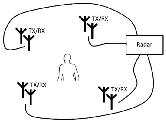 The work reported in [45], demonstrated the concurrent breathing and heartbeat measurement capabilities by using a MIMO radar that exploits a TDM technique. Four transmitting/receiving couples of antennas have been randomly distributed around a person standing 4 m away from the radar. A graphical representation of the scenario has been shown in Figure 8.