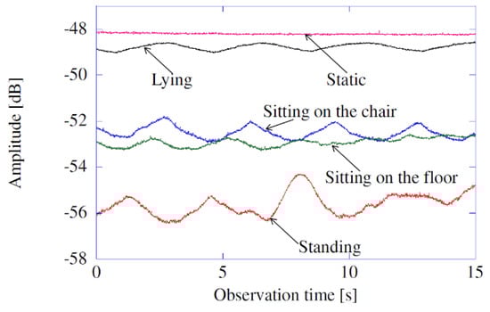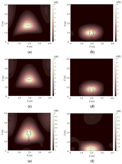 As shown in Figure 11, where the measurements have been performed on a single person (a,b) standing, (c,d) sitting on a chair, and (e,f) lying on the floor, the different postures might be clearly recognized with good accuracy.