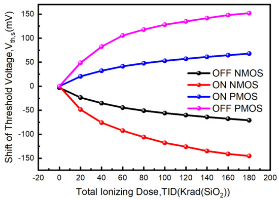 Total ionizing dose effect (TID) refers to the cumulative effect on the semiconductor devices caused by ionizing radiation over the exposition time [28,29]. Many research works have revealed that TID effect causes slow change of the deviceโs electrical properties, such as the transistorโs threshold voltage, off-state current, subthreshold swing and carrier mobility [30]. We test the impact of TID effect on the threshold voltages of both P-channel Metal Oxide Semiconductor (PMOS) and N-channel Metal Oxide Semiconductor (NMOS) transistors fabricated in 180 nm Bulk CMOS technology and experimental results are shown in Figure 1. The figure illustrates that TID induced threshold shift is dependent on device type (NMOS or PMOS) and voltage bias (on or off-state). The effect of radiation makes threshold voltage of NMOS lower (easier to switch on) for both the on/off states and the reduction is larger at on-state. Whereas, the effect of radiation makes the absolute value of threshold voltage of PMOS higher (more difficult to switch on) and the increment is larger at off-state.