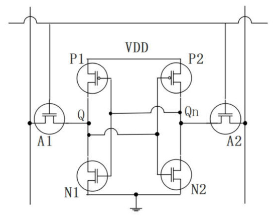 Figure 2 shows the schematic of a 6T SRAM cell formed of two cross-coupled inverters and two access transistors and its power-on characteristic is mainly determined by the mismatch of two cross-coupled inverters, especially the threshold voltages of transistors [3]. According to the measurements in literatures [3,24,31], if the mismatch of two PMOS transistorsโ threshold voltages ( is sufficiently large, it should be regarded as a strong cell. In this case, the bigger is, the more stable power-on data of the cell will be. Conversely, if is very small (, it should be taken as a weak cell. In such case, the power-on process is determined mainly by the mismatch of two NMOS transistorsโ threshold voltages (. And the bigger is, the more stable power-on characteristic will be.