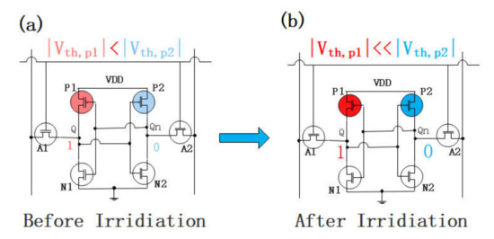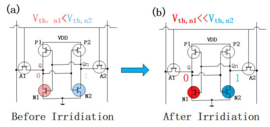 (a) Weak cell before irradiation and (b) weak cell after irradiation. If a weak cell outputs unstable logic โ0โ before irradiation, it will output stable logic โ0โ after irradiation.