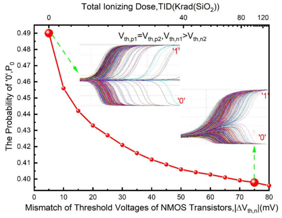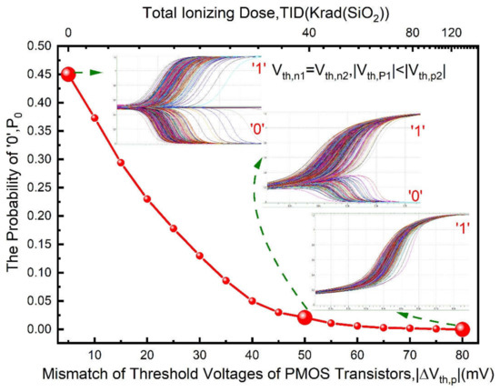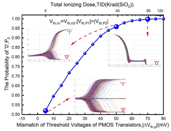For a strong cell, PMOS transistors dominate its power-on behavior as discussed in Section 3. Thus, for simplification, the will be added step-by-step and the will always be equal to zero in simulations. The simulation results are shown in Figure 5 and Figure 6, there are non-linear increasing relationships between total ionizing dose and for both figures. As deduced by TID increases, if is larger and larger than , the power-on data of the cell will be more and more stable as โ0โฒ shown in Figure 5, otherwise the power-on data of the cell will be more and more stable as โ1โฒ shown in Figure 6. It is also noteworthy for both Figures that the probability of โ0โฒ or โ1โฒ will become more than 0.9 when the dose accumulates to 40 Krad (SiO2) and the increases to approximately 50 mV.