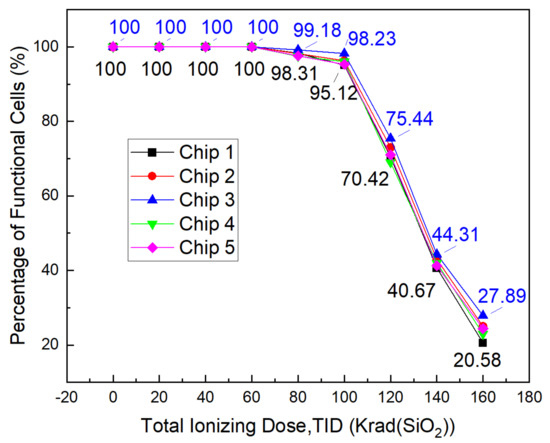 Ratio of functional cells vs. total irradiation dose, 100 Krad(SiO2) is a distinct turning point.