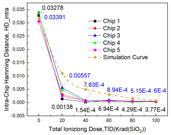 In our work, the promotion of the TID effect on the stability of SRAM PUF is explored experimentally. Irradiation experiments are performed on one type of commercial SRAM with memory capacity of 32KB. To help us carry out TID experiments more effectively, transient noise simulations have been performed on a SRAM array whose memory capacity is equal to the commercial SRAM chip and the simulation steps are similar to what is described in Section 4. The simulation results are plotted in Figure 9. The figure reveals that intra-chip hamming distance (๐ป๐ท_๐๐๐ก๐๐) drops markedly when ionization dose attains about 40 Krad (SiO2) and it will be equal to the ideal value (zero) when ionization dose reaches 180 Krad (SiO2). Of course, these values can be regarded as overestimates because the effect of has been ignored in the simulation models and so actual ionization dose will be controlled 0 Krad (SiO2)โ160 Krad (SiO2) in TID experiments.