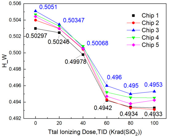 Hamming weight () representing uniformity of the power-on data at each irradiation step is displayed in Figure 13. remains slightly above 0.5 before irradiation and keeps more and more close to 0.5 under 40 Krad (SiO2). Above 40 Krad (SiO2), becomes less and less than 0.5. Considering should be as close as possible to 0.5, the accumulated ionization dose keeping uniformity close to ideal value is supposed to remain at about 40 Krad (SiO2). And the exposure time for this dose is just about 13 min at the dose rate of 50 Rad (SiO2)/s.