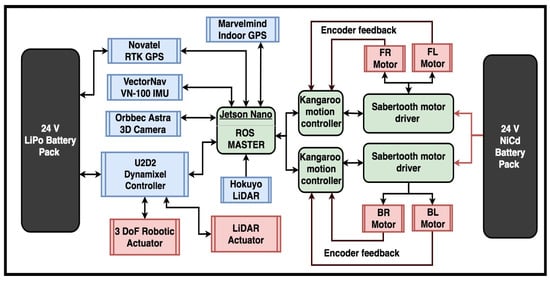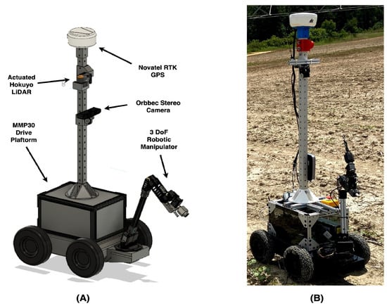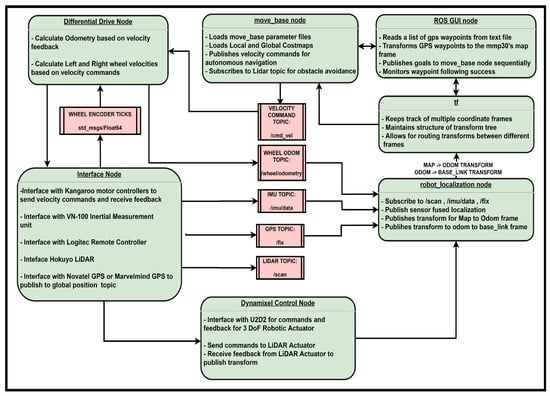 MARIA is an autonomous differential drive rover with various phenotyping sensors and a three DoF manipulator (Figure 1). The main computational system on board the MARIA rover is a Jetson Nano (Jetson Nano, Nvidia, CA, USA) running Ubuntu (an open-source Operating System using the Linux kernel, version 18.01) with the Robot Operating System (ROS Melodic). The overall system design is illustrated in Figure 2.