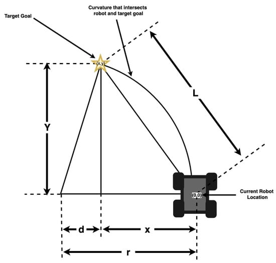 From Equations (1)–(3), the curvature C that the robot has to follow to reach the look ahead coordinate can be determined in Equation (4). As the robot moves, the curvature is recalculated continuously as the look ahead point is updated continuously at a distance L. The robot is essentially continuously pursuing this point by following some curvature.