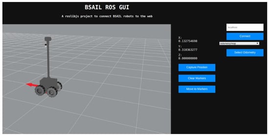 For high level control a Graphic User Interface (GUI) was added that provides a 3D RViz-like window to visualize the URDF, odometry heading, and present location of the robot in its TF “world_frame” (Figure 5). The GUI utilizes ROS, the HTML/CSS/JavaScript web stack, roslib.js, ros3d.js and the Apache web server to provide an intuitive interface to send position commands for robots in the field. The window is accompanied by a small amount of additional telemetry (odometry) as well as some interactive elements to control various parts of the client. Upon accessing the GUI via a web browser, the user can enter the IP address of the robot they wish to connect to, and select the odometry topic they wish to use for visualization from the drop down menu. Once the robot is connected, they can use the “Capture Position”, “Clear Markers”, and “Move to Markers” buttons to capture and display an odometry waypoint, clear existing odometry waypoints, or move the robot to existing odometry waypoints in the order they were captured.