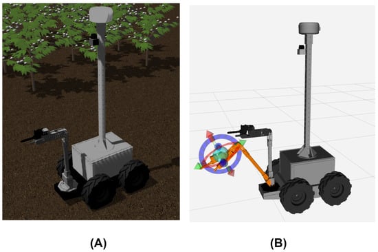 Simulation of the robot in (A) Gazebo and (B) Moveit RViz Visualizer in Robot Operating System (ROS).