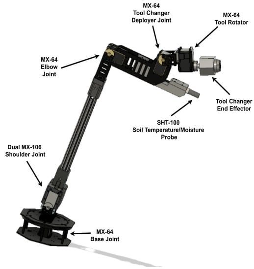 Various toolheads were designed and 3D printed to validate the toolhead changing capability of the robotic manipulator. One end-effector was a drill to penetrate soil and to allow for the insertion of a temperature and humidity probe that is later detailed in this paper. A prototype soil sampling cartridge was also designed with the ability to be picked up with the end toolhead changer and then be rotated into the soil. At the end of the cartridge are angled jaws that scrape the soil and then through the downward pressure of the cartridge exerted by the robotic manipulator the loosened soil pushes into the cartridge as it rotates. Once rotated down to a sufficient degree, the soil is compacted into the opening and later well lodged in the cartridge. Additionally the soil cartridge has a screw top opening allowing for easy opening to access gathered soil as well as for wash and reuse.
