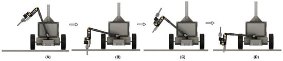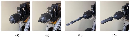 Multipurpose toolhead at the end of the manipulator. (A) Toolhead with jaws retracted; (B) Toolhead with jaws extended; (C) Toolhead with a soil drill bit; (D) Toolhead with a soil sampler.