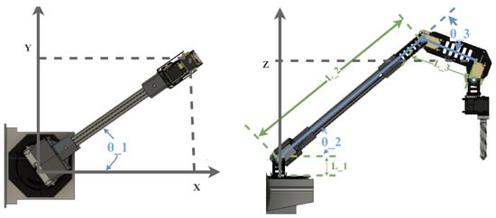 The analytical solution for the inverse kinematics for a 3 DoF articulated manipulator is presented through Equations (6) and (7) and Figure 9 [49]. General equations are provided because the robot arm was made of extrusion and it is possible to have various length configurations for the links and .