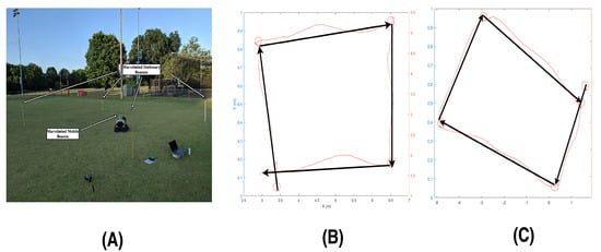 Navigation results. (A) Marvelmind based navigation setup; (B) Marvemind beacon navigation result; (C) RTK Novatel GPS navigation result. Red lines indicate the real rover trajectory while the black straight lines represent the ideal path.