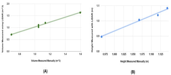 LiDAR phenotyping results. (A) Volume estimation; (B) Height estimation.
