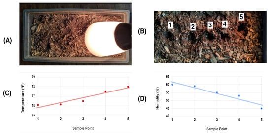 Soil sensing setup. (A) Soil conditioning with a lamp; (B) Soil measurement locations; (C) Temperature measurement profile; (D) Moisture measurement profile.