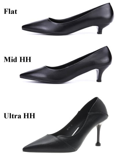 We recruited female participants who wear HH for at least 5 days a week, for an average of 12 h a day (including walking, sitting and standing). In order to avoid other factors such as age, height, and weight to impact the results, we selected 35 subjects with the age range from 19 to 27, and with similar builds. Participant details are shown below: age: 23 ± 4 years; height: 164.3 ± 12.4 cm; mass: 51.8 ± 7.6 kg. Each of the participants was informed before the experiment of its aim and the measuring method. All of them signed a consent to participate in the study. Prior to the gait measurement, we conducted a short survey asking questions about the preferred types of footwear and how frequently they wear HH. Two-thirds of the participants answered that they preferred flat shoes in their day to day life. One-third of them preferred high heeled shoes, even with the heels more than 8 cm in height. All of them wore 3 kinds of shoes (flat, mid HH and ultra HH) for this study.