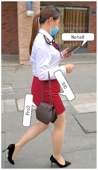 All of the participants were asked to walk for 4 min on a flat ground, as shown in Figure 3, the recording devices, the 3 smartphones that was mentioned before were held on their hands, attached to their waists, and placed in their handbags, respectively, as shown in Figure 4.
