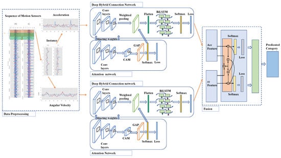 where , are the weighted parameters of the different streams, and , are the learned features from accelerometer and gyroscope, respectively. The attention weights are normalized by softmax to create the attention map for each type of sensor.