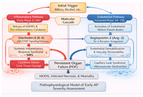 Background: Early identification of patients at risk for severe acute pancreatitis (SAP) remains a major clinical challenge. Circulating biomarkers reflecting systemic inflammation (IL-6) and endothelial dysfunction (Ang-2) have emerged as promising tools for improving early prediction of persistent organ failure and other adverse