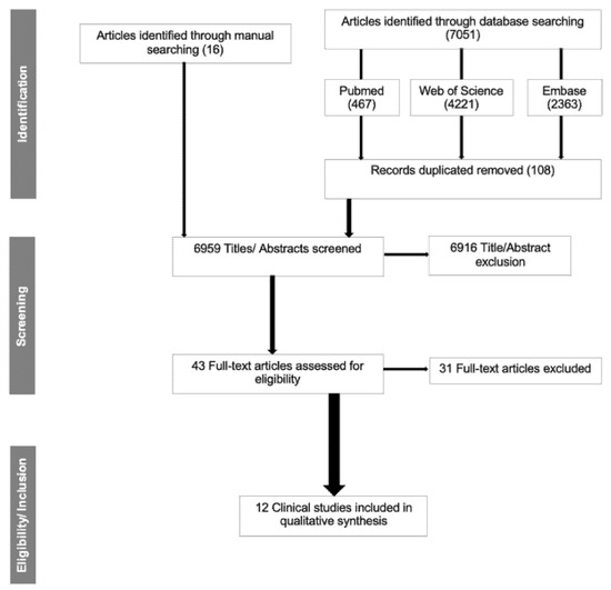 A total of 7051 articles were identified through database searching, 467 from PubMed, 4221 from Web of Science, and 2363 from Embase. A further 16 publications were considered from the manual search through the references of the included articles. From 7067 articles, 108 were excluded due to duplication. Therefore, 6959 articles were screened by title and abstract based on the inclusion and exclusion criteria (Table 2). After the title and abstract screening, 43 articles were included for further analysis. Subsequently, there was a full-text assessment, in which 31 articles were excluded based on the exclusion criteria detailed in Table 3. Twelve articles [33,34,35,36,37,38,39,40,41,42,43,44] met the inclusion criteria and were included in the current review (Figure 1).