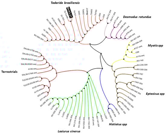 Genetic typing of partial nucleoprotein gene (264nt) from Argentinean rabies virus strain. The phylogenetic tree was constructed using the maximum-likelihood method, and bootstrap values were calculated from 1000 replicates with the software MEGA X (https://www.megasoftware.net/; Accessed: 15 May 2021). The tree obtained was edited using the online tool iTOL v6 (https://itol.embl.de/). Representative RABV sequences were included to define the groups of circulating reservoir species in Argentina []. The sample NV93-21 (underlined in the image) corresponds to the case under study (GenBank accession number OM909029).