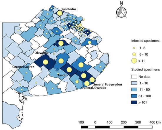 There are previous reports of rabies detection in insectivorous bats in the province of Buenos Aires (Figure 3). Between 2014 and September 2020, rabies was detected in approximately 6% of the total chiropterans studied. In the municipality of Coronel Suárez, cases of rabies have been detected in Tadarida brasiliensis and Myotis sp. bats without interruption since 2018 []. According to available provincial information, the annual rate of veterinary rabies vaccination coverage achieved with public resources remained on average at 14.5–15.0% until 2019. In August 2020, there was a marked decrease (2.9%) attributable to movement restrictions and strict social isolation associated with the COVID-19 pandemic [].